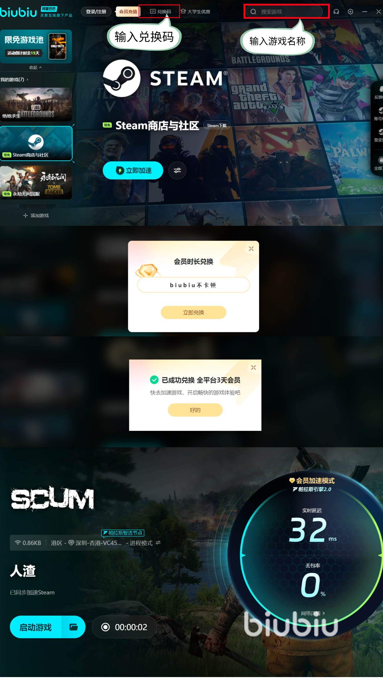 而且新用戶還可以享受超多福利,比如24小時免費加速時長,當然普通用戶也都可以享受一定的福利,所有小伙伴都可以用【biubiu不卡頓】兌換一次三天的體驗時間。