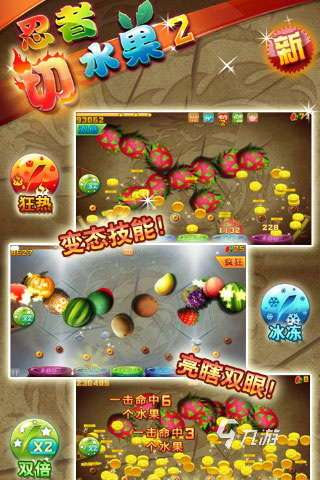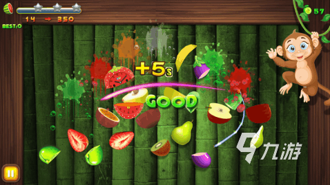 這是一款經(jīng)典的切水果游戲,游戲規(guī)則十分簡(jiǎn)單,玩家只需要在規(guī)定的時(shí)間內(nèi),通過滑動(dòng)屏幕畫出一條軌跡,利用軌跡將面前的水果切成兩半,就可以完成游戲。