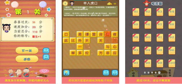 整個(gè)游戲涉及到的成語(yǔ)比較多,而他卻直接跟消除游戲結(jié)合在一起,簡(jiǎn)單來(lái)說(shuō)就是玩家在。體驗(yàn)游戲時(shí)如果能夠匹配合適的成語(yǔ)就能夠達(dá)到消除的條件,在游戲里面有經(jīng)典的接龍模式,而玩家也能夠體驗(yàn)消除特色。畢竟每個(gè)玩家在選擇體驗(yàn)手游的時(shí)候,所針對(duì)的偏好往往是不一樣的,當(dāng)然不同的成語(yǔ)它所涉及到的主題往往是不一樣的,此時(shí)玩家也需要不斷的去強(qiáng)化記憶,完成每日挑戰(zhàn)。