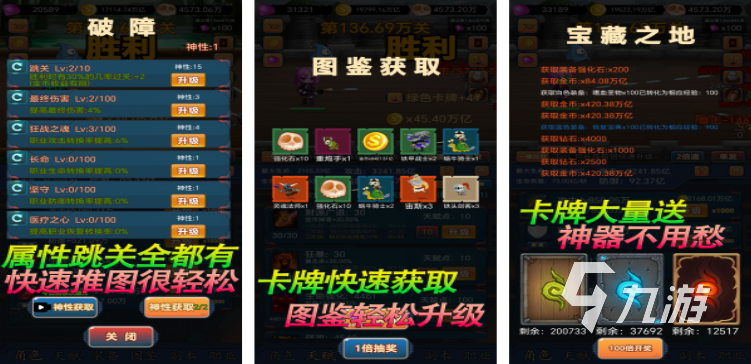 在這款掛機打怪的手游當中玩家們可以去通過各種人物職業(yè)技能的搭配,輕松消滅各種小怪。玩家們可以去升級角色的防御或者是攻擊屬性,而這些升級所用的金幣也是非常容易獲得,在推圖的過程當中玩家們還可以進行屬性跳關(guān),各種強化石、鐵甲戰(zhàn)士等卡牌也能夠快速的獲取或者是升級更有超級多的卡牌贈送,輕輕松松獲得神器根本不用愁!如果是想解放自己的雙手或者是喜歡上班時間摸魚的朋友們可以去試試這款打怪游戲哦