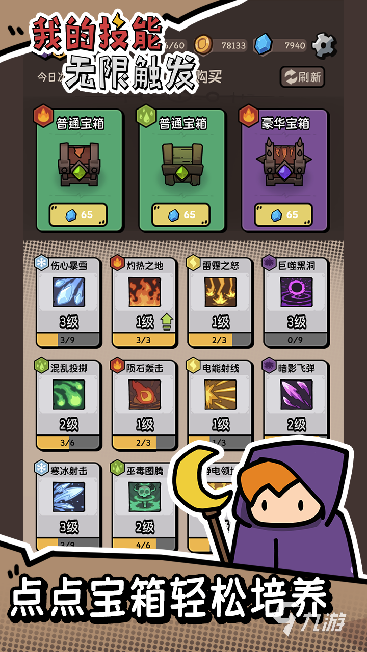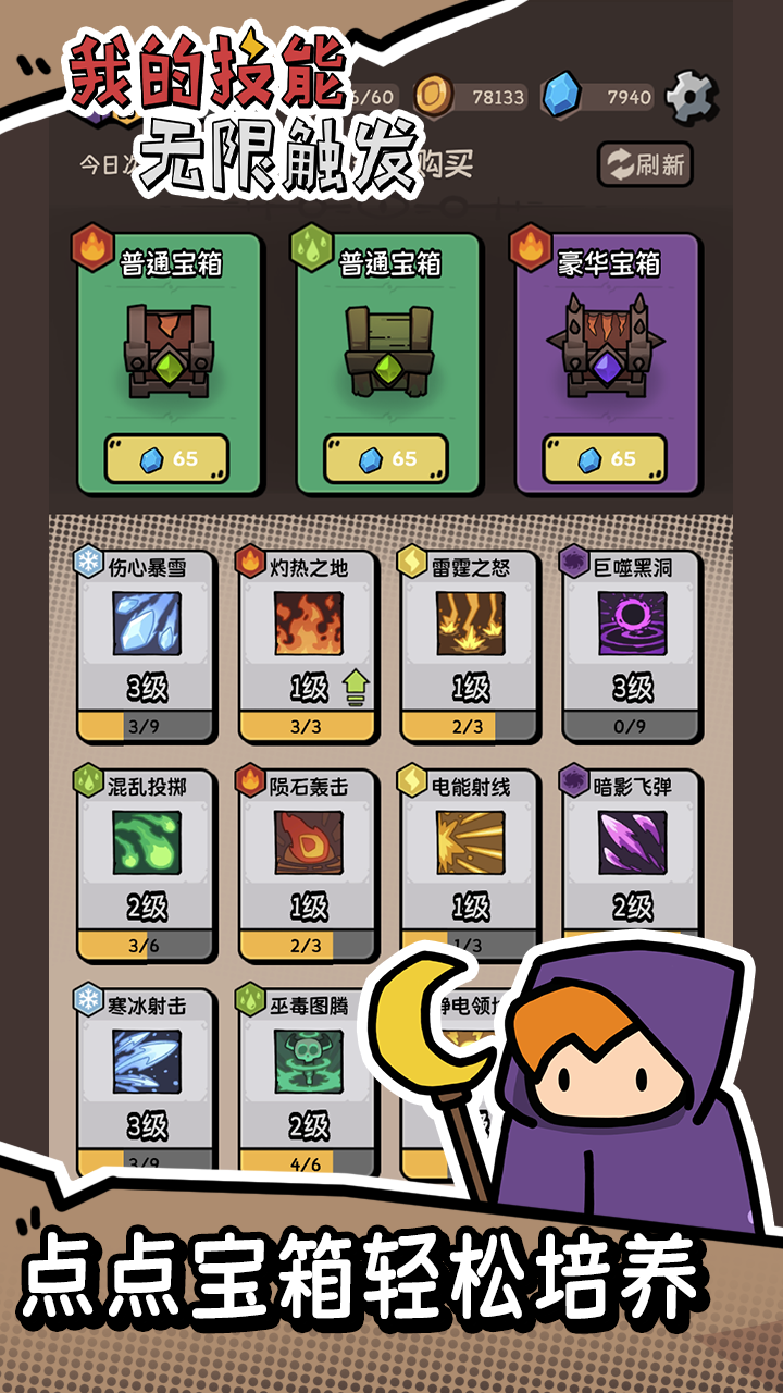 《我的技能無限觸發(fā)》這款游戲完美地與它的名字相適配,游戲中玩家的技能可以無限觸發(fā),在rogue 游戲中,它的玩法也相對于很簡單,但是他完全可以讓你感受到割草般的快感。游戲內(nèi)可以進行自我英雄強化,強化后的角色會更加強大,在挑戰(zhàn)時能有更高的傷害,挑戰(zhàn)成功后會寶箱,里面的獎勵都可以隨意使用。