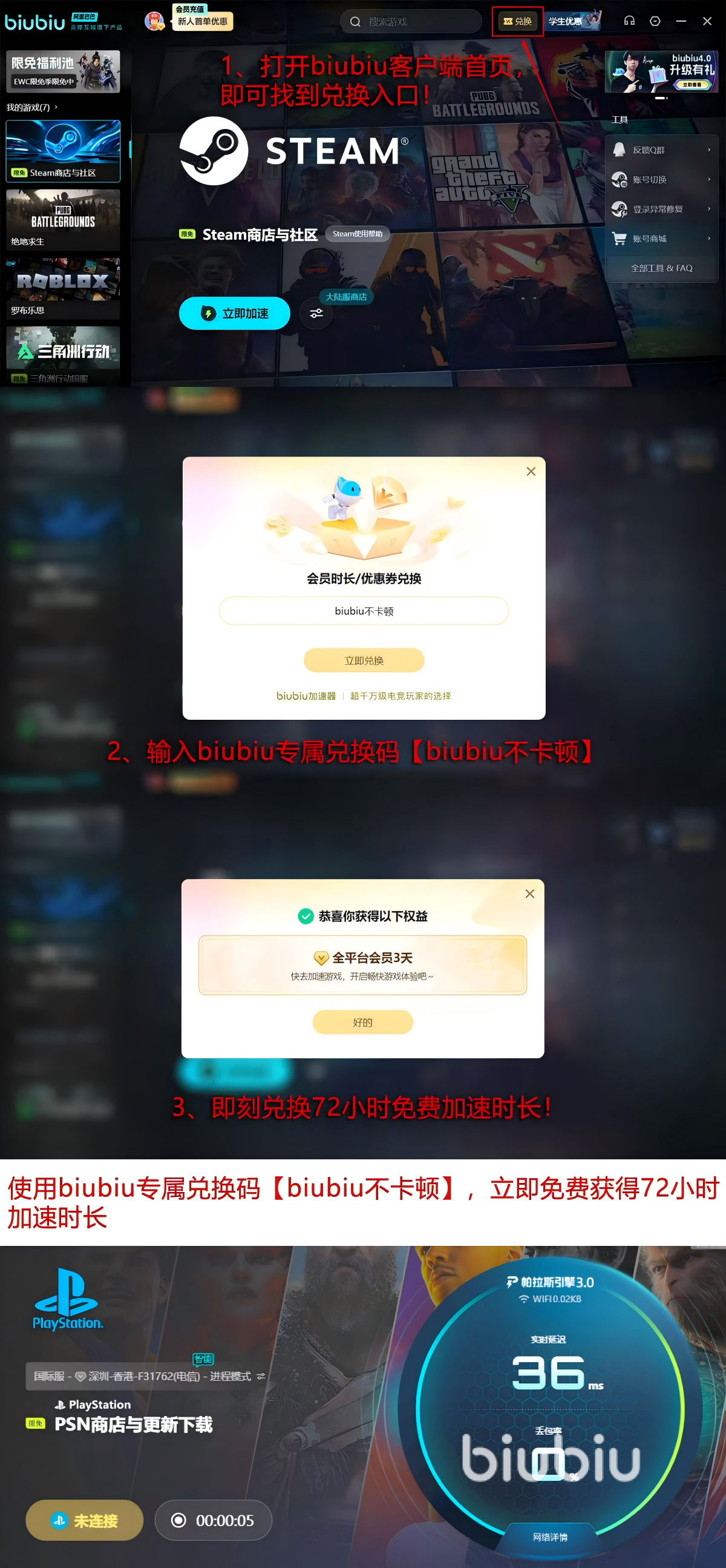 使用者福利一定要領(lǐng)到,剛注冊賬號的新人,登錄就有新用戶禮包送24小時服務(wù)時間,首頁這里按照下圖教程,可利用【biubiu不卡頓】再領(lǐng)取到72小時額外使用時間,新人以上步驟全完成,一下能用96h加速服務(wù)。