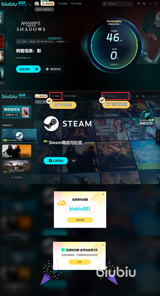 biubiu加速器目前推出了非常豐厚的活動福利,特別是新用戶注冊后,登錄就能領(lǐng)取3小時免費加速時間,而且如果你使用兌換碼【biubiu001】,還能夠獲得額外72小時加速,這樣一來,總共可以享受到75小時的加速體驗,實在是太劃算了!有了這些加速支持,游戲啟動下載的速度和后續(xù)游戲的體驗都會有質(zhì)的飛躍。