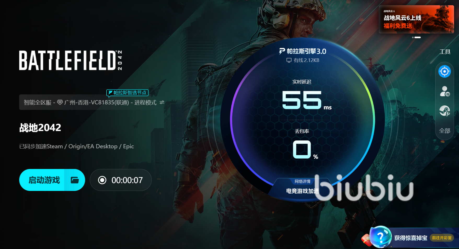 戰(zhàn)地2042的魅力在于那種超大規(guī)模戰(zhàn)爭(zhēng)的沉浸體驗(yàn)每一次空襲每一次爆炸都充滿(mǎn)震撼??ㄔ诩虞d界面,就像戰(zhàn)斗之門(mén)遲遲不開(kāi),所有策略都被堵在門(mén)外。啟動(dòng)biubiu加速后,網(wǎng)絡(luò)路徑被迅速疏通,戰(zhàn)門(mén)瞬間打開(kāi)。連接通路一旦打通戰(zhàn)斗激情就會(huì)重新點(diǎn)燃。游戲不該止步于加載界面而是要踏入硝煙與炮火之中。當(dāng)畫(huà)面順利跳轉(zhuǎn)當(dāng)戰(zhàn)斗正式開(kāi)始真正的戰(zhàn)役才剛剛拉開(kāi)帷幕。
