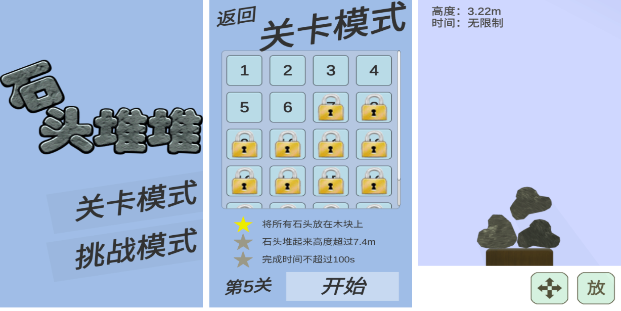 石頭堆堆這款石頭主題的闖關(guān)手游整體操作很簡單,但是想要達成通關(guān)條件還是比較困難的,關(guān)卡數(shù)量眾多又包含著不少高難度的模式,關(guān)卡、挑戰(zhàn)賽等基礎(chǔ)堆石頭玩法休閑感拉滿,每一關(guān)都有著三星成就需要大家達成,主線任務(wù)就是放置石頭不斷堆積達到一定的高度,但容錯率超級低絕對不能讓石頭掉下來,操作按鍵超級少大大提升了上手速度喲。