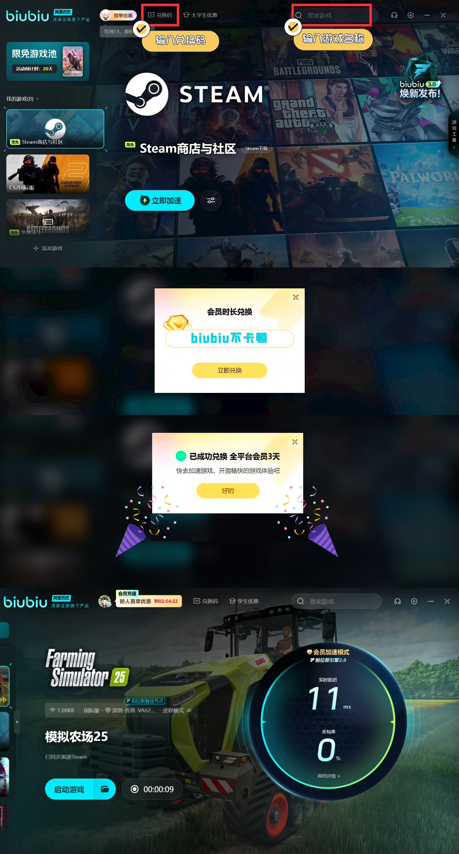 biubiu加速器內(nèi)現(xiàn)在上線了多個(gè)福利活動(dòng),一個(gè)是適用于所有用戶的,大家只需輸入兌換碼【biubiu不卡頓】,就能領(lǐng)到3天的加速時(shí)長,如果你是新用戶的話,那么完成注冊后,還能領(lǐng)到24小時(shí)的加速時(shí)長。