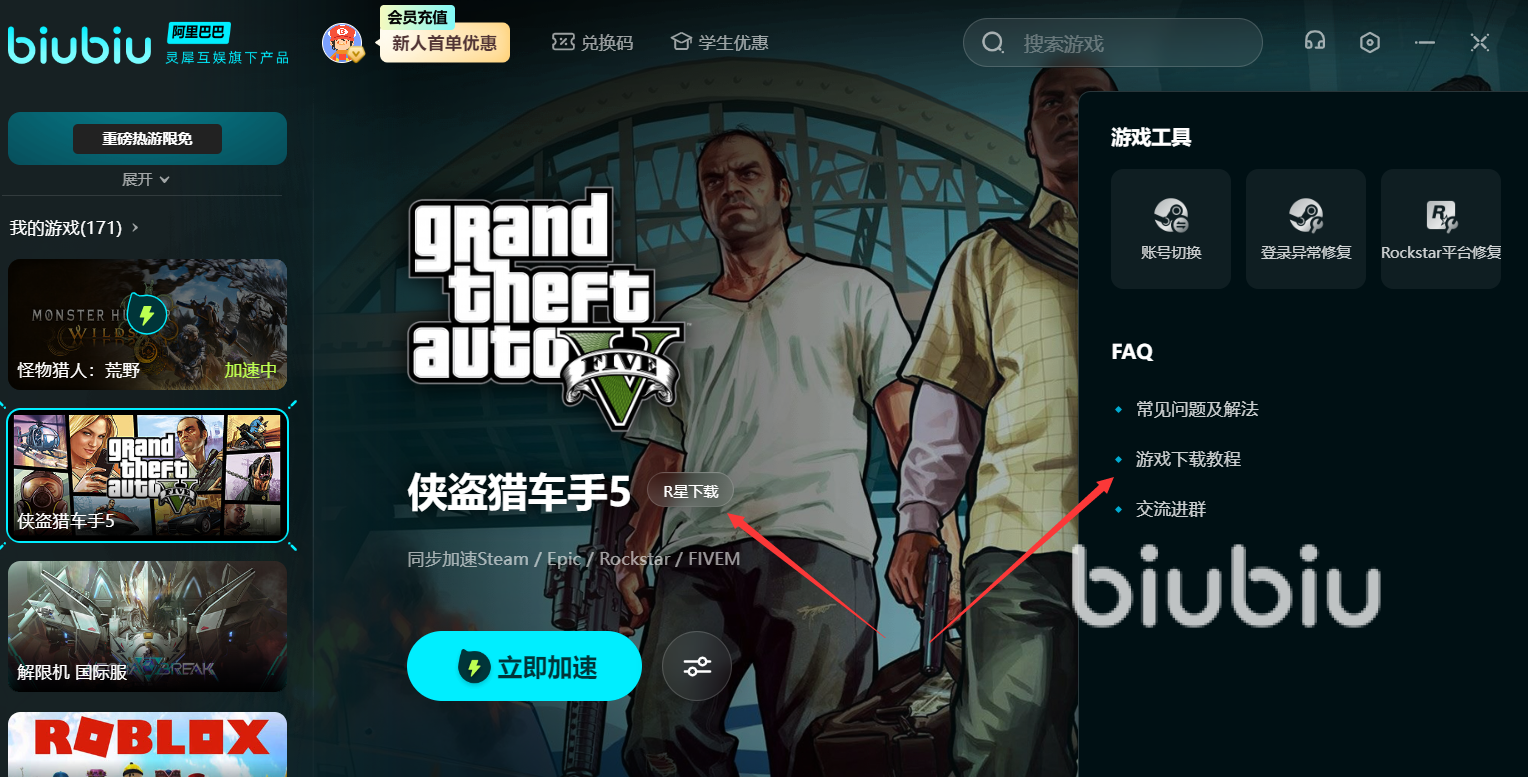 同樣地,如果你更傾向于R星,需要先下載R星客戶端,登錄賬號(hào)后搜索它的名字,點(diǎn)擊游戲圖標(biāo)即可進(jìn)入安裝流程。各位可能經(jīng)常發(fā)現(xiàn)找不到正確的官網(wǎng)地址,或者有些還可能去了假網(wǎng)站,導(dǎo)致沾染病毒或者財(cái)務(wù)還可能受到威脅。這種情況可以從biubiu里找到該作的加速頁(yè)面,這里就有下載地址可以一鍵直達(dá)了。