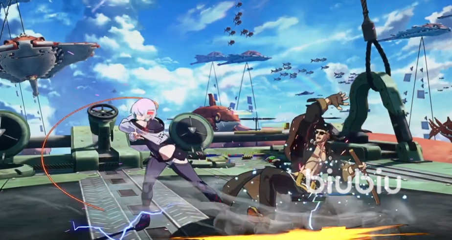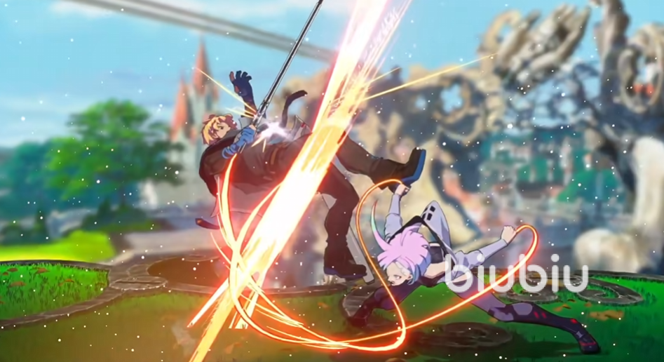 這個(gè)角色的戰(zhàn)斗風(fēng)格延續(xù)了動(dòng)畫(huà),視覺(jué)效果上保留了動(dòng)畫(huà)中的紫色系短發(fā)以及機(jī)械義肢的特征,同時(shí)融入賽博畫(huà)風(fēng),比如發(fā)光紋路以及粒子特效,走高速雙刀流,搭配了罪惡裝備本身比較經(jīng)典的連攜技以及ex技系統(tǒng),走的是近戰(zhàn)爆發(fā)以及連擊的玩法,角色流暢度比較高。