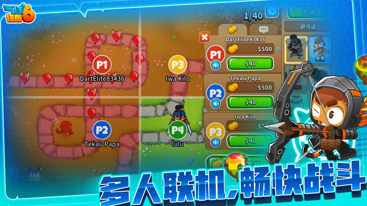 氣球塔防6是款氣氛休閑且戰(zhàn)斗效果酣暢的塔防游戲,能四人聯機分屏挑戰(zhàn)各種強度的敵人,主角是一群可愛擬人的野猴子,這些猴子身懷異能可使用不同武器防御陣地,敵人則是一些造型可愛的小氣球,將關卡中源源不斷的氣球消滅干凈即可通關,猴子主題加上塔防策略元素的玩法新鮮感不錯,多人聯機塔防模式的加持也顯得極為熱鬧。