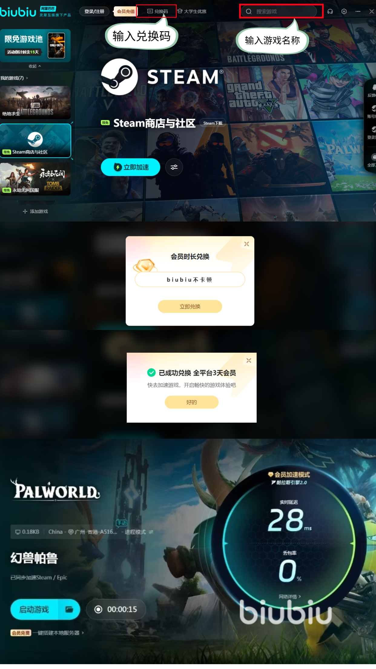 如果大家想下游戲的速度快一點(diǎn),并且后續(xù)玩游戲有一個(gè)比較好的體驗(yàn)環(huán)境的話,就用上方推薦的加速器,現(xiàn)在下載還有超多福利可以能夠獲取比如新用戶登錄注冊(cè)及客戶的24小時(shí)免費(fèi)加速服務(wù),此外,平臺(tái)的每個(gè)小伙伴還可以利用兌換口令biubiu不卡頓兌換三天的體驗(yàn)時(shí)間。