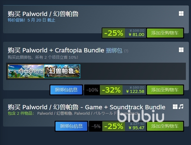 最近的特價(jià)活動(dòng)讓幻獸帕魯每個(gè)版本的價(jià)格都減少了幾十元,首先第一個(gè)版本大家只需要花費(fèi)81元,高級(jí)一點(diǎn)的版本需要花費(fèi)122.58元,不過(guò)大家要注意的是特價(jià)活動(dòng)到5月20日就會(huì)截止,所以想要購(gòu)買的小伙伴記得及時(shí)去買。
