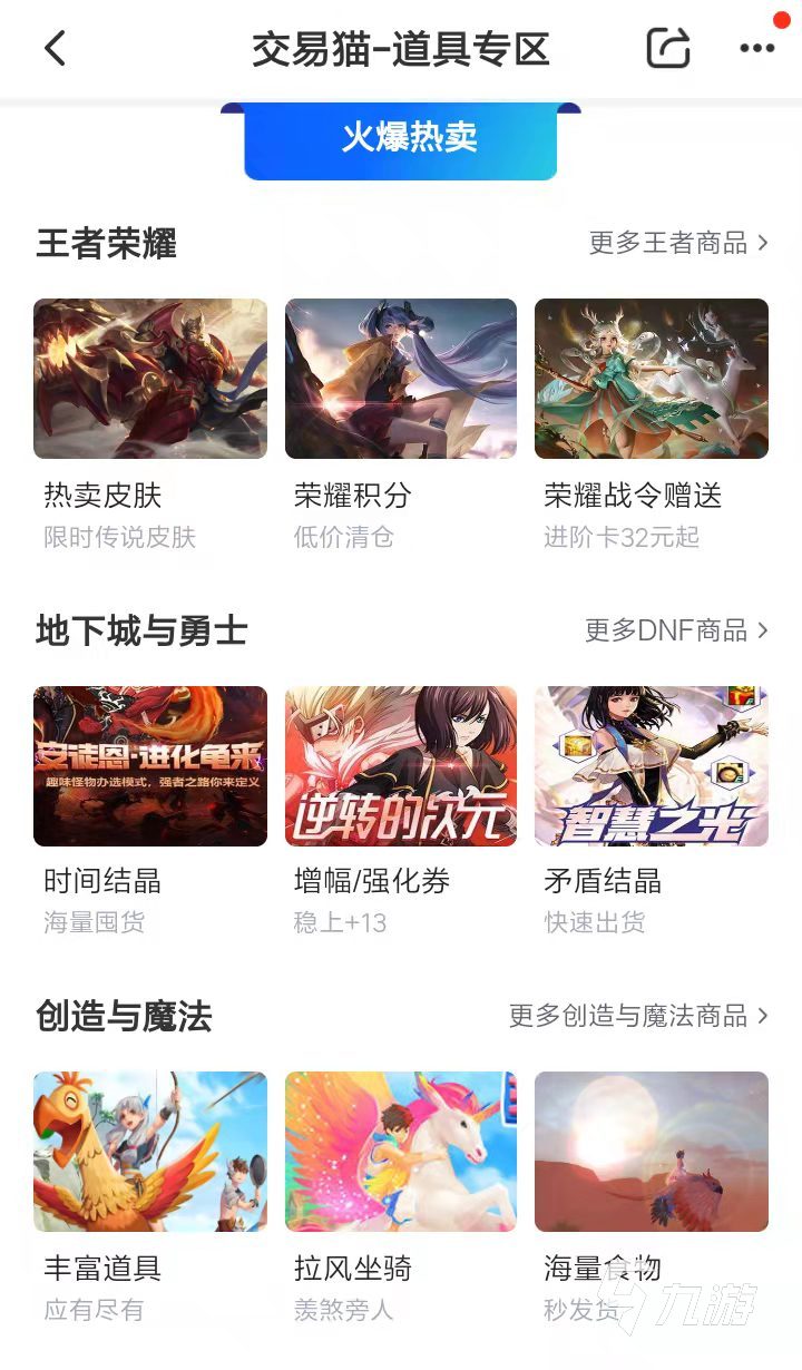 除了能夠幫助玩家們進(jìn)行各種游戲的賬號(hào)出售以外,交易貓app當(dāng)中還為大家提供了各種熱門(mén)游戲的道具交易。通過(guò)首頁(yè)進(jìn)入到道具專(zhuān)區(qū)之后,玩家們即可輕松找到各種熱門(mén)游戲的道具交易信息,其中包括了皮膚、積分、裝備、游戲金幣等等。