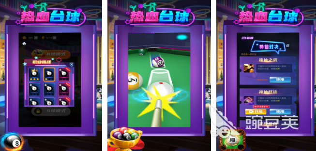 街機臺球大師手游照著街機的風(fēng)格做,重點在競技對抗和操作技巧,界面是復(fù)古的樣子,像在街機廳里打臺球的感覺,有1V1實時對戰(zhàn)也有多人參加的錦標(biāo)賽,擊球的時候得看準(zhǔn)力度條,調(diào)好角度,玩一些高級玩法還得考慮母球打完后的位置,方便接下來繼續(xù)擊球。