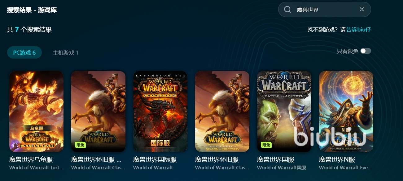 在biubiu上搜索魔獸世界的相關(guān)游戲可以發(fā)現(xiàn),這個游戲有多個版本。不久前推出的版本是魔獸世界懷舊服,而且還有國服版本。現(xiàn)下這個版本的游戲內(nèi)容在biubiu游戲庫內(nèi)屬于是限免游戲,因?yàn)樵谶@個游戲圖標(biāo)上有一個【限免】的標(biāo)識,擁有這個標(biāo)識的游戲,玩家在使用biubiu進(jìn)行加速時是免費(fèi)的,不過限免活動會有時間限制,當(dāng)限免標(biāo)識消失的時候也就是意味著這個游戲的限免時間到期了,玩家想要繼續(xù)使用biubiu來進(jìn)行游戲的加速,就要選擇成為biubiu的會員了。