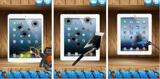 螺絲刀以及錘子等等,都是成為你惡搞時的最主要武器,可利用這款游戲來惡搞其他的朋友。屏幕上方會看到高清的平板,當(dāng)其他朋友在玩平板時,寧可利用手中的破壞武器,立即點擊屏幕特別逼真的聲音,仿佛真的手機屏幕在破碎一般。就連屏幕破裂的畫面都特別的真實,開局時可能屏幕特別完整,但在你的手指點擊之后,屏幕會支離破碎。