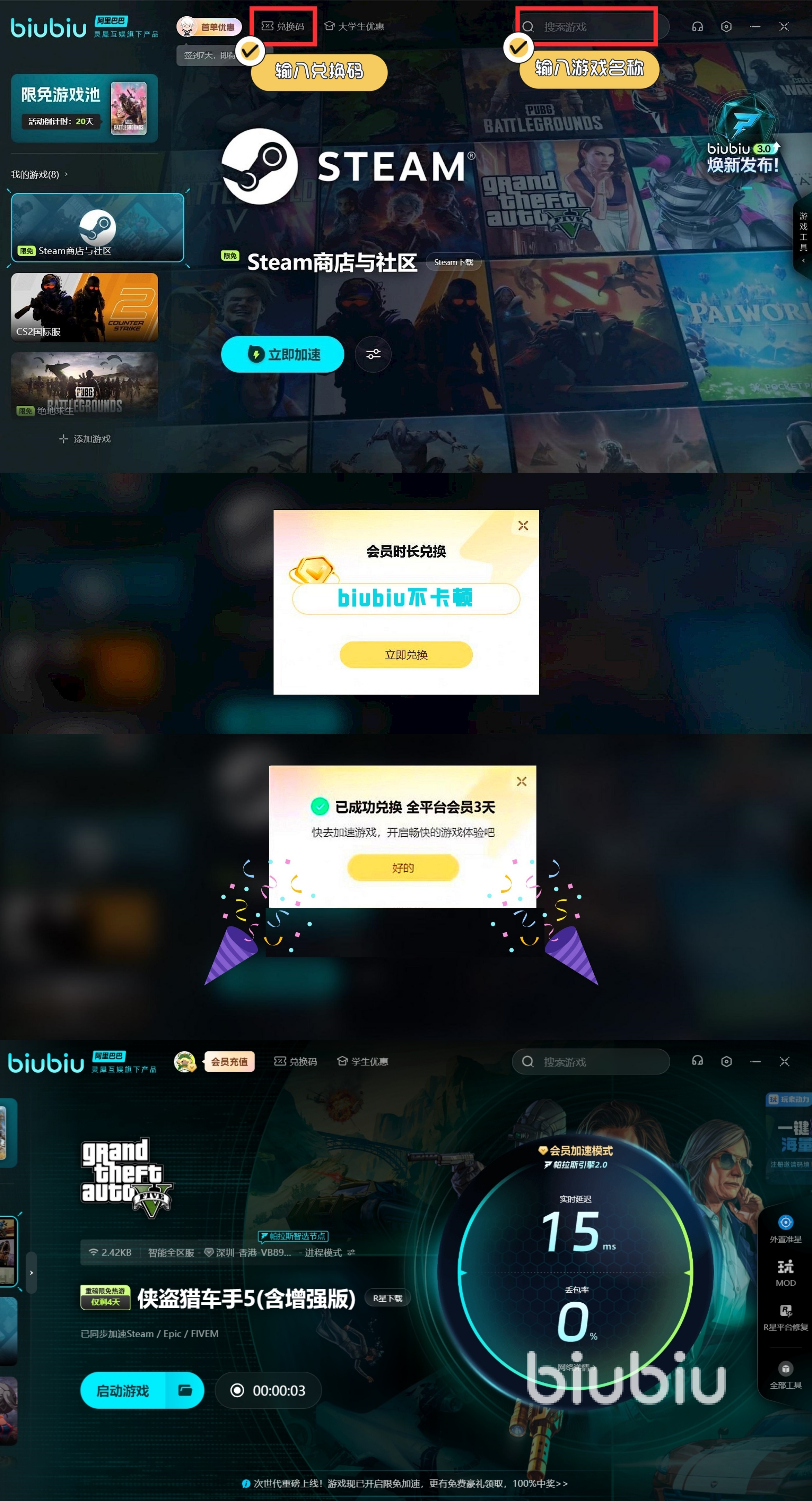 不僅如此,biubiu加速器福利滿滿,新用戶注冊(cè)即可享受免費(fèi)3小時(shí)的體驗(yàn)福利,輸入兌換碼【biubiu不卡頓】,不論新老用戶還能額外獲得72小時(shí)的加速時(shí)長(zhǎng)。新人加起來(lái)足足有75小時(shí)的免費(fèi)加速服務(wù),讓玩家盡情體驗(yàn)其強(qiáng)大功能。