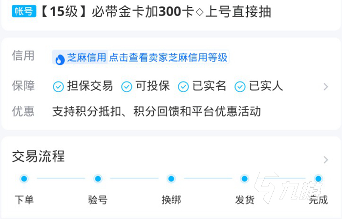 最后就是安全性了,我們隨意點開一個賬號的詳情中都可以看到賣家完成了擔保、實名以及實人的認證,而交易流程細分到了下單、驗號、換綁、發(fā)貨以及完成這五個步驟并且全部都在交易貓平臺的監(jiān)管下??梢哉f交易貓是大家進行賬號交易的不二選擇。