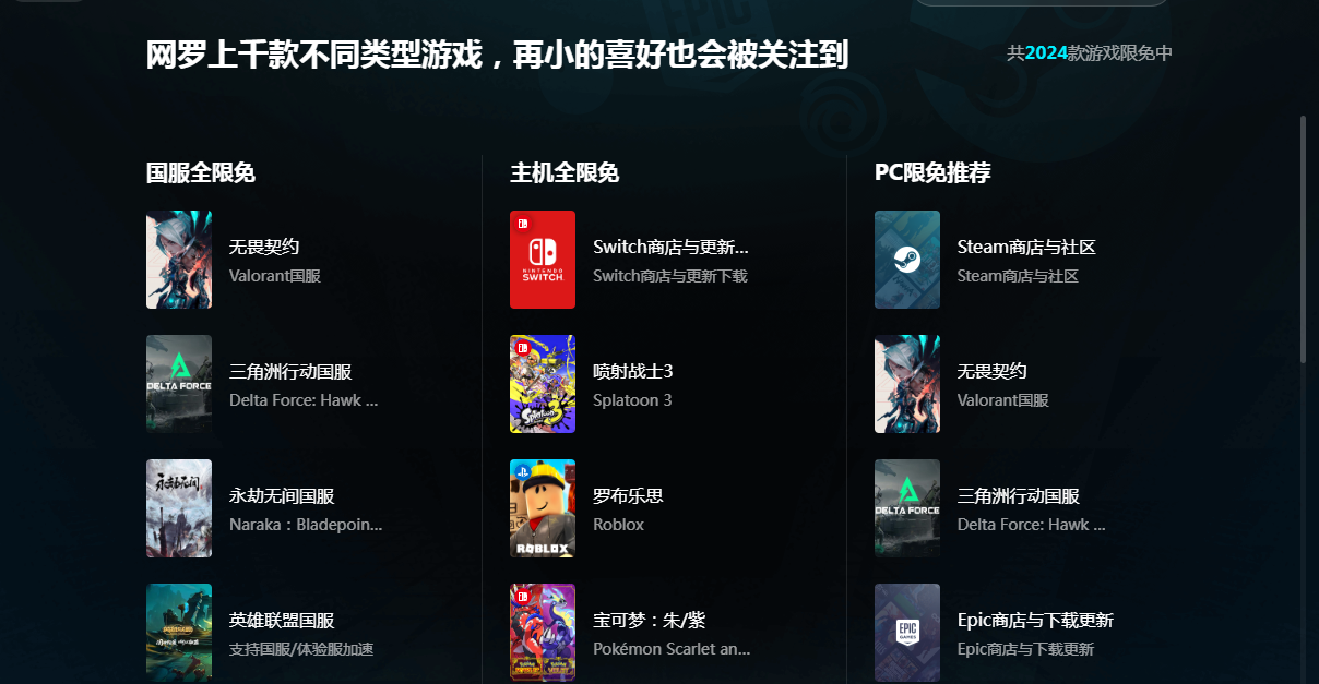 對(duì)于喜歡嘗試不同游戲的玩家來說,加速器的限免游戲?qū)^(qū)也是一個(gè)主要的亮點(diǎn),這個(gè)專區(qū)就會(huì)覆蓋steam平臺(tái),還有暴雪平臺(tái)的游戲。玩家進(jìn)入到專區(qū)內(nèi)就可以找到近期熱門的限免游戲。無論是暴雪平臺(tái)上的守望先鋒還是steam平臺(tái)上的文明六。都可以通過以上的加速器去實(shí)現(xiàn)免費(fèi)加速,在體驗(yàn)限免游戲時(shí),玩家就不需要擔(dān)心網(wǎng)絡(luò)卡頓會(huì)影響到游戲的體驗(yàn)。加速器會(huì)全程的優(yōu)化網(wǎng)絡(luò)鏈路,確保游戲的下載還有運(yùn)行過程的順暢。