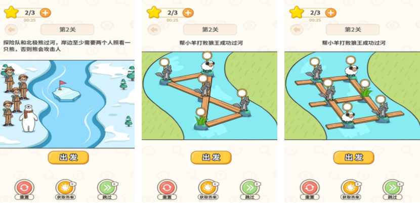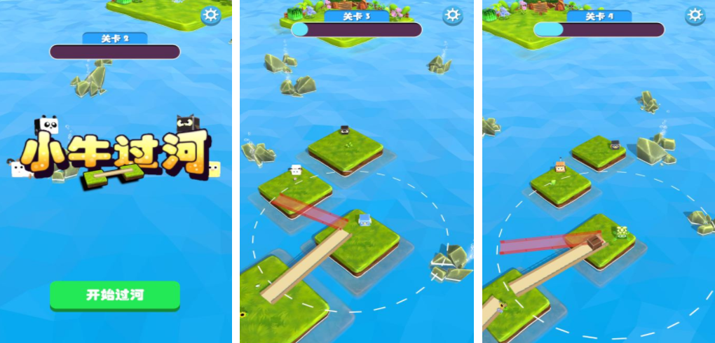 想要鍛煉反應能力的玩家可以嘗試一下小牛過河,里面會設(shè)定大量立體的浮空島嶼,在這些島嶼之間的距離是各不相同的,玩家在進入到島嶼之后,系統(tǒng)會給出木板,需要玩家在游戲里快速滑動屏幕,讓木板可以搭建到對面的島嶼上,這樣玩家就可以在游戲里不斷穿梭,拯救這些動物,并且?guī)椭鷦游锏竭_終點,每個關(guān)卡的設(shè)定都不一樣,玩家可以在游戲里不斷進行挑戰(zhàn)。