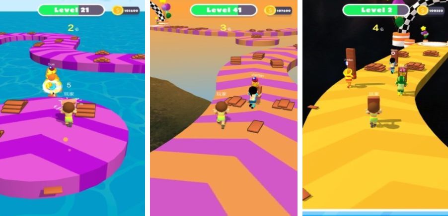 在搭橋我最快這個游戲里,會設(shè)定一個色彩豐富的場景,里面會設(shè)定一個浮空場景,玩家要和其他的兩名成員開啟一場比拼,游戲開始之后,需要在游戲里收集相應顏色的木板,收集到足夠的數(shù)量之后就可以搭建到游戲設(shè)定的懸浮索道上,只有木板達到足夠的數(shù)量才能建成橋梁,讓玩家順利進入到下一個島嶼,可以通過和其他成員不斷比拼,鍛煉各自的手速能力,每個關(guān)卡中對于玩家顏色的要求都不同,需要快速操作,這樣才能最先完成木板的收集和搭建。