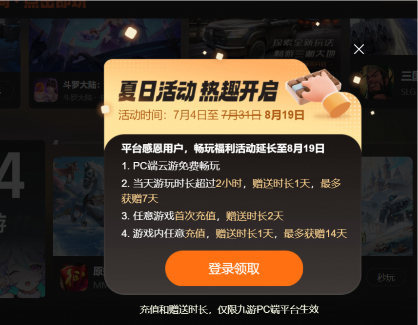 一般的云游戲平臺的游戲都是有體驗時長的,九游云游戲也是如此,但是現(xiàn)在的福利很到位,有一個暑期的暢玩活動,可以持續(xù)到8月19日,所以在此期間,小伙伴們在線是可以放心暢玩其中的游戲的。