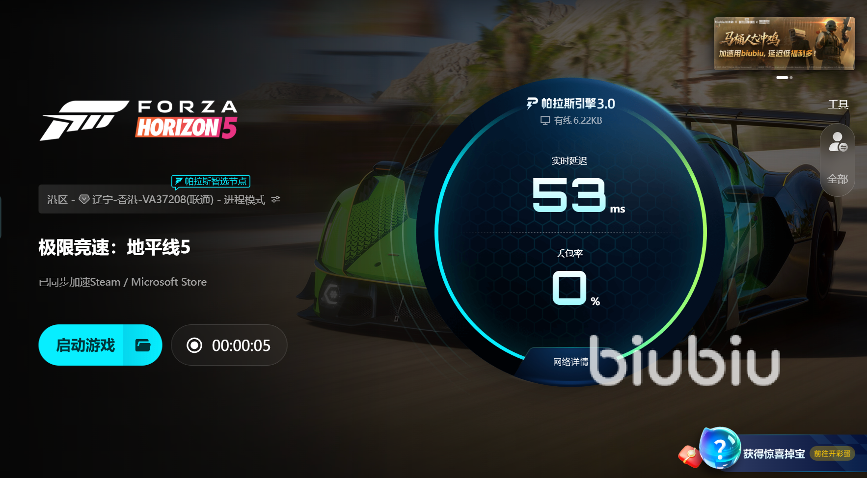 打開biubiu的過程就像拉開車門坐進(jìn)一臺(tái)準(zhǔn)備就緒的賽車。啟動(dòng)biubiu客戶端在搜索欄輸入極限競(jìng)速地平線5,選擇游戲后點(diǎn)擊立即加速。幾秒鐘內(nèi)系統(tǒng)會(huì)自動(dòng)為你連接最佳節(jié)點(diǎn),無需手動(dòng)調(diào)整,甚至能感覺到網(wǎng)絡(luò)“換擋”的瞬間變得順滑。然后重新進(jìn)入游戲,畫面加載速度更快,動(dòng)態(tài)事件無縫銜接,就像現(xiàn)實(shí)世界突然變得更加真實(shí)。