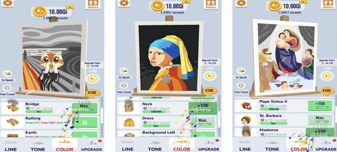 美術(shù)館里會(huì)展出哪些名作呢?玩家點(diǎn)擊按鈕,視野中將會(huì)出現(xiàn)各種名畫,進(jìn)行觀摩,點(diǎn)擊各種按鈕可以對(duì)名畫進(jìn)行自由創(chuàng)作,當(dāng)然了,如果玩家出現(xiàn)審美疲勞的時(shí)候,可以點(diǎn)擊下方的第三個(gè)按鈕進(jìn)行顏色轉(zhuǎn)換,它也是一款放置類游戲,所以玩家可以帶著輕松的心情暢游在美術(shù)的世界。
