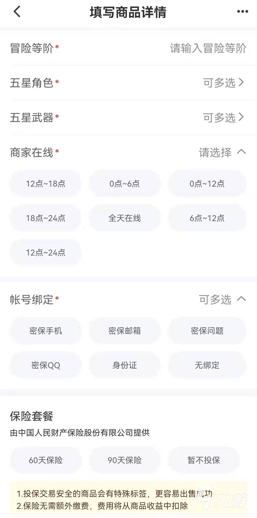 如果沒有選擇智能發(fā)布,那么我們就需要自己手動填寫賬號中的主要情況,這一點(diǎn)平臺也為我們提供好了模板,我們只需要在對應(yīng)的位置輸入自己賬號的冒險(xiǎn)等階,擁有哪些五星角色,擁有哪些五星武器就可以了。這三個(gè)方面就是衡量一個(gè)原神賬號價(jià)值的主要方面,最后將自己理想的價(jià)位發(fā)布出去,就可以等著買家上門了。