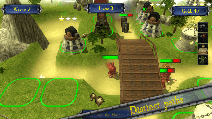 《王國塔防》每個故事主題下,拓展出的對戰(zhàn)環(huán)境都是不盡相同的,在游戲的音效系統(tǒng)中,運用了一種激昂且深沉節(jié)奏設(shè)定,各種新奇百怪的防御塔可進行自由的混搭,玩家將在王國城堡周圍,去布置出防線滴水不漏的塔防配置,與入侵的敵對國家進行交戰(zhàn),每種防御塔在達到一定等級,都可以利用召喚石進行進化。使整體的射程威力更加的恐怖如斯。
