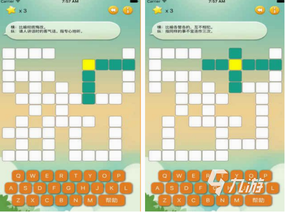 此款需要正確填字保證成語成立就是鍛煉玩家水平,也是非常好玩的成語接龍類型手游。無論是所具備的玩法還是益智的游戲特點(diǎn),大家都能在這里面享受寓教娛樂的游戲特色,涵蓋1400多個(gè)關(guān)卡,不僅沒有任何的廣告,也沒有任何重復(fù)的情況。你需要在鍵盤上面,輸入文字對應(yīng)的拼音首字母以后,就可顯示出正確的答案。
