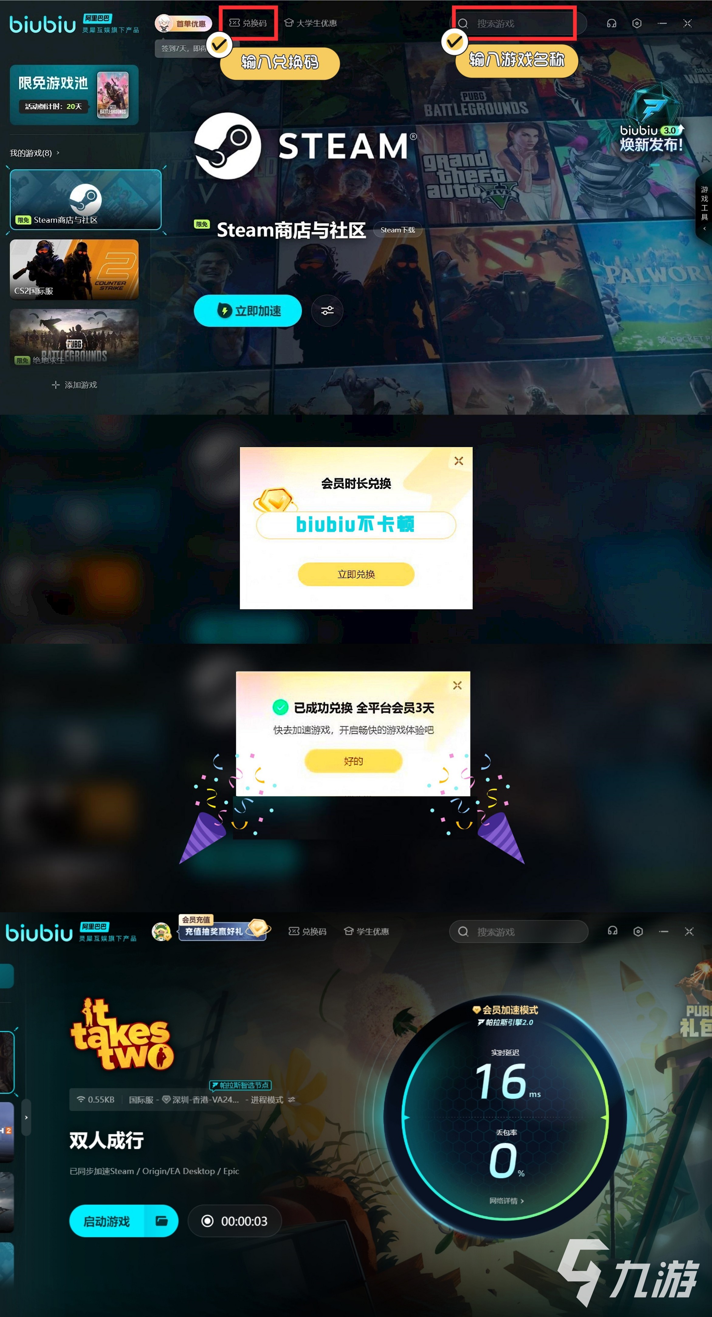 眾多玩家在使用biubiu加速器后,都驚喜地發(fā)現(xiàn)在游玩《雙人成行》時,卡頓現(xiàn)象得到了極大改善,雙人同屏幕的合作體驗得到了充分保障。而且,由于合作操作更加順暢,通關(guān)的用時也明顯縮短。除了出色的加速性能,biubiu官方還為玩家準(zhǔn)備了豐厚福利。各位用戶只需在首頁輸入【biubiu不卡頓】的兌換口令,就能輕松兌換到三天的體驗時長。若你是首次使用biubiu的新用戶,登錄還能額外領(lǐng)取3小時的加速時間呢。