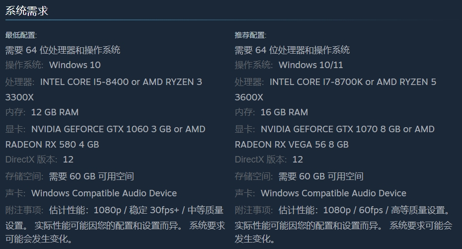 操作系統(tǒng)最低常規(guī)的Win10即可,處理器因特爾i5-8400,RAM需達到12GB RAM,顯卡AMD580。此外,存儲空間60GB,需要提醒的是,以上配置僅能保證游戲在1080p分辨率下以中等畫質(zhì)流暢運行,具體表現(xiàn)可能會因設(shè)備配置和設(shè)置有所不同。