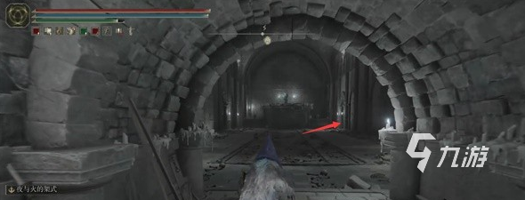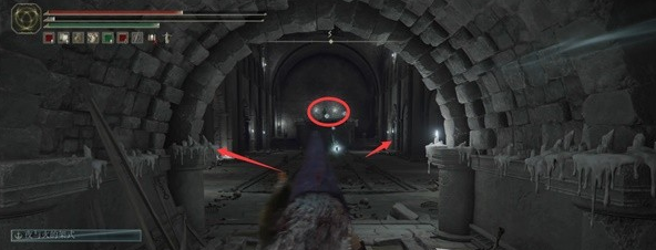 首先我們從墓地平原的北邊找到入口,就可以進入到這個地下世界了,可以坐電梯然后激活賜福點,這樣我們就能來到這個比較寬敞一點的大廳了。這里的頭頂時不時會有釘板砸下,所以要特別小心。當釘板升起時,我們可以迅速躲到左側的洞穴里,以躲避這一致命的攻擊。而在這個大廳里,我們還會遇到一些小怪,它們會掉落一把名為大蜥蜴大劍的武器。