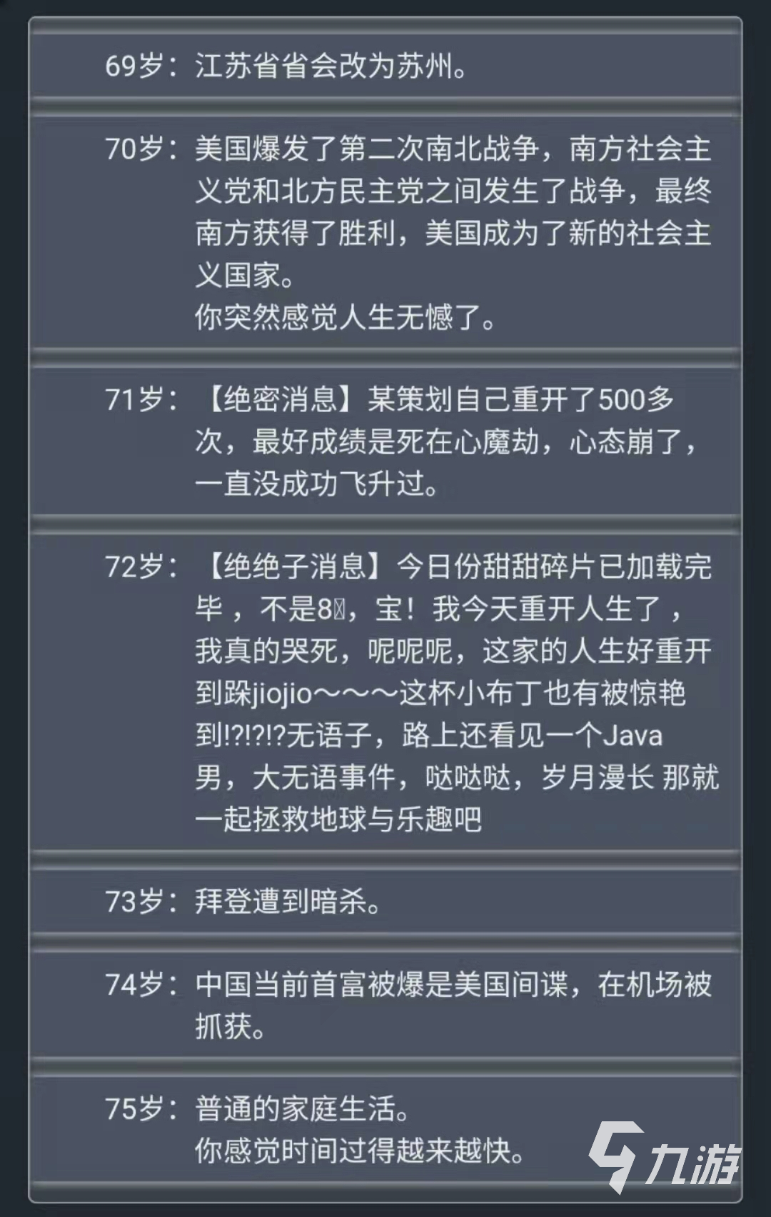 紫色膠囊、覺醒、人類進化與超凡都是與橙色天賦相似的天賦,帶來的屬性加成則略弱一些。轉(zhuǎn)世重修是配合修仙人生比較合適的一個天賦,在渡劫失敗后可以重生,屬性較高的話大概率會在本次人生中再次開啟修仙之路,進行第二次修仙渡劫??颂K魯會使人生間接性的出現(xiàn)大腦錯亂,修仙路上大概率會在400歲時san值歸零然后死亡,智力夠高的話則可以避免該情況。
