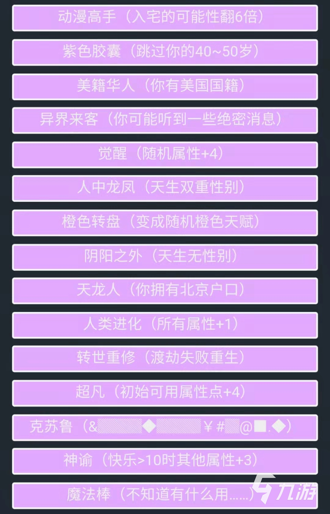 游戲中可選擇的天賦分為不同的品質(zhì),越好的天賦抽到的機率也越小,其中紫色天賦是稍差于橙色天賦的,一共有15個能夠抽到的天賦,一些能夠帶來特別的游戲人生,一些則能夠增加角色的身體屬性。其中魔法棒、動漫高手同時搭配的情況下,角色大概率在年輕時會變身魔法少女,進行一些拯救世界的活動,挑戰(zhàn)觸手女王時失敗后會被洗腦,最終也許會被修仙者所消滅。