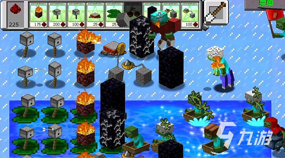 這是款跟模仿植物大戰(zhàn)僵尸制作的mc游戲,游戲里的僵尸、植物都是方塊制作的,看上去非常有意思,游戲中的方塊植物會(huì)發(fā)射一些弓箭射擊僵尸,僵尸被擊中幾次之后就會(huì)死亡,玩家要做的就是阻擋所有僵尸的靠近。你也可以種植一些非常堅(jiān)固的防御性植物,這些植物能夠有效阻止僵尸們前進(jìn),也可以保護(hù)身后的植物們。