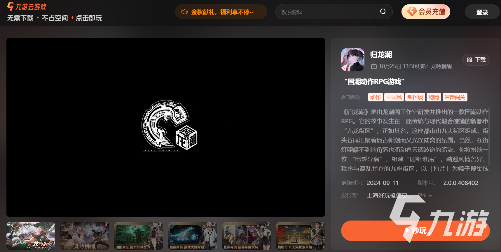 一個現(xiàn)代與傳統(tǒng)相融合的城市,一座隱藏著無數(shù)驚天秘密的九龍城。歸龍潮讓你化身為一位電影導(dǎo)演,帶領(lǐng)你的劇組踏上揭開城市神秘面紗的冒險之旅。今天小編就帶來歸龍潮云游戲平臺推薦,無需下載繁重的游戲客戶端就能夠體驗游戲了,因為歸龍潮現(xiàn)已上線九游云游戲平臺,讓你可以隨時隨地開始這場奇妙的探險。