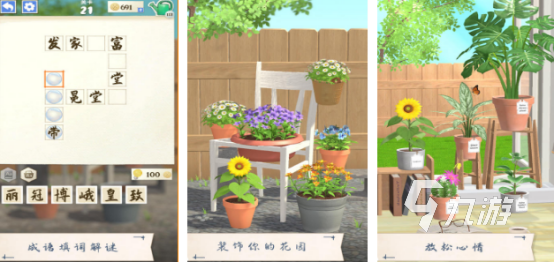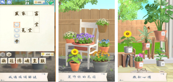 讓你的休閑時光不再枯燥無聊,將成語接龍,填空與劇情相結(jié)合,玩家成為從大城市回到老家的女孩,告別城市燈紅酒綠的生活,來到奶奶的花園當(dāng)中種花種草。為了讓各種花花草草正常的生長,需要完成成語填空或者成語接龍關(guān)卡來獲得水滴和肥料。此游戲適合不同的年齡段,通過完成關(guān)卡積累更多的詞匯量。