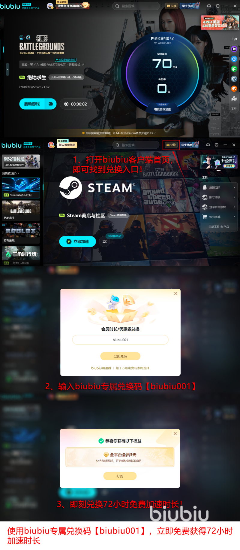 而且biubiu加速器的另一大優(yōu)勢是超長的免費體驗時間。新用戶注冊即可獲得24小時免費加速,輸入禮包碼【biubiu001】還能額外領(lǐng)取72小時,總計96小時的加速時長,足以覆蓋這幾天的高強度游戲需求。相比市面上許多僅提供短暫試用的加速器,biubiu加速器的福利更加親民,讓玩家有充足的時間測試加速效果,再決定是否長期使用。而且它的操作極其簡單,只需在biubiu加速器里搜索“絕地求生”,選擇之后,點擊加速即可自動優(yōu)化網(wǎng)絡(luò),無需手動切換節(jié)點,新手也能一鍵加速,非常的方便快捷。