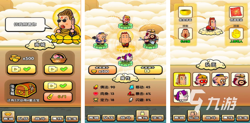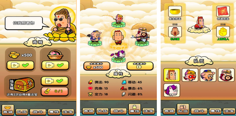 本作是款氣氛跟劇情塑造很搞笑的西游主題肉鴿游戲,游戲中的取經(jīng)團隊和神仙角色表情搞笑,大腦袋小身體的造型也給人忍俊不禁之感,西游主題的各種劇情進行了杜撰和重新刻畫,極高的辨識度以及搞笑畫風(fēng)塑造也很硬核,點觸角色可以進行切換或者強化,放置戰(zhàn)斗帶來的肉鴿戰(zhàn)斗方式也充滿新意,挖寶藏、角色互動等休閑類模式應(yīng)有盡有。