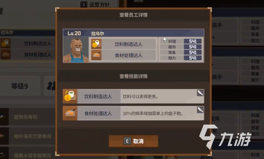 當(dāng)員工成為經(jīng)理級(jí)別的時(shí)候,料理則會(huì)影響能使用菜品的等級(jí),達(dá)到500的數(shù)值便能解鎖9級(jí)的菜品。在這個(gè)游戲里只會(huì)有出餐的快慢,而不會(huì)有做菜的快慢,因此料理的等級(jí)只要達(dá)標(biāo)就行并不用特別高的等級(jí)。