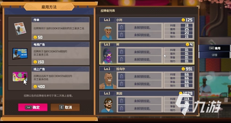 主店的經(jīng)理推薦用戴夫,作為主人公的他非常全能,分店的則可以用德瑞,他擅長(zhǎng)調(diào)制雞尾酒和做清理工作。廚房烏爾、米倉(cāng),分店詹姆斯、查理。大堂主店用埃爾尼諾、猛禽,分店用樹(shù)、詹迪。