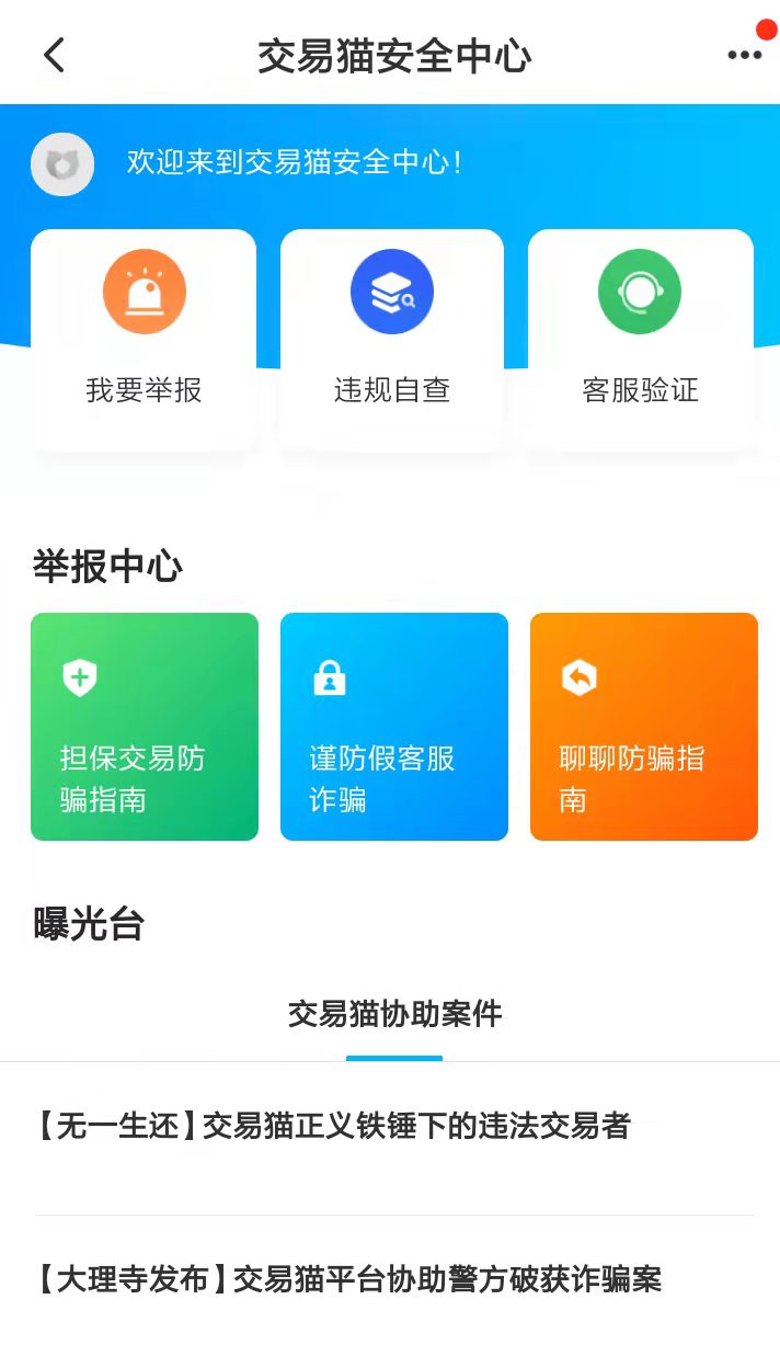交易貓app為玩家們提供了大量游戲交易信息的同時(shí),還為用戶(hù)們提供了安全中心。進(jìn)入到安全中心之后,玩家們可以直接對(duì)部分不良賣(mài)家進(jìn)行舉報(bào),各種應(yīng)用指南也會(huì)幫助玩家更快速的了解如何使用交易貓app。