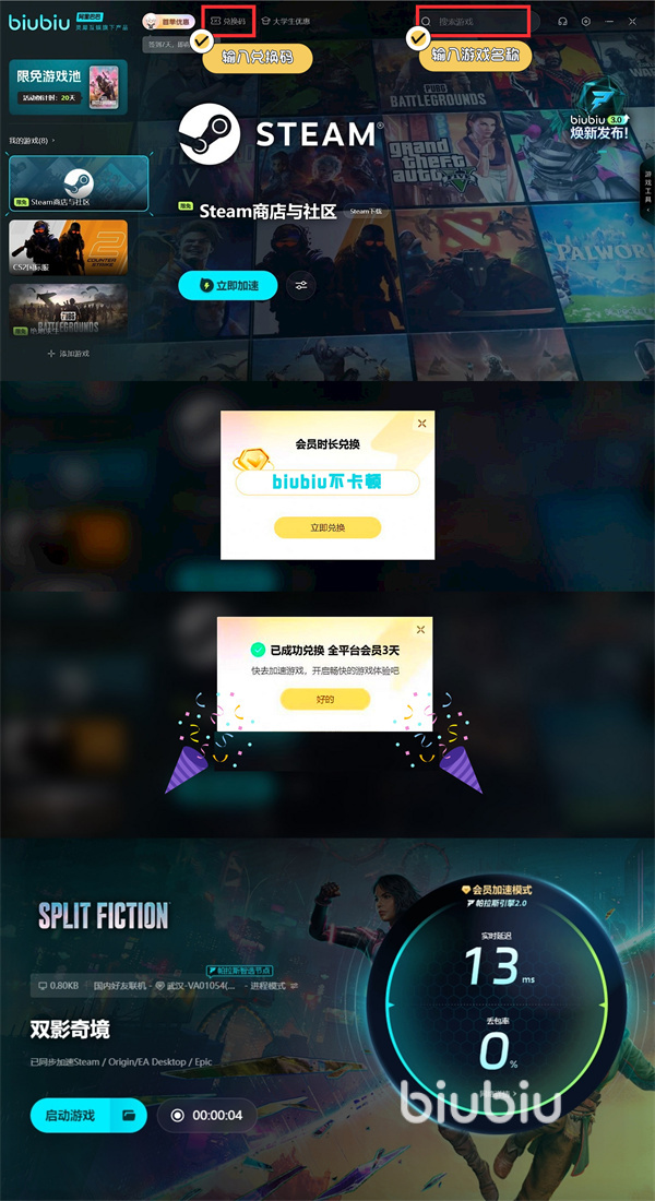若是玩家想要去解鎖更多福利,那么還可考慮去點擊界面中的兌換,然后輸入【biubiu不卡頓】,如此就能順利的領取到72h的加速時長哦。