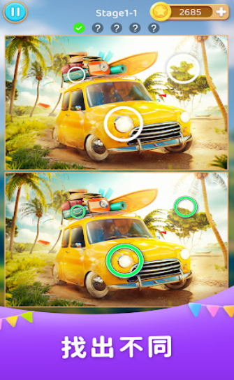 這款游戲就是讓大家來(lái)鍛煉眼力的,有兩張幾乎一樣的圖擺在大家的眼前。任務(wù)就是找出他們不同的地方,不要看這個(gè)任務(wù)看似很簡(jiǎn)單,但是一些細(xì)微的差別一點(diǎn)也不好找,需要靜下心來(lái)瞪大眼睛瞧仔細(xì)了,游戲里的主題有很多,越往后玩兒關(guān)卡就會(huì)越難,但是每過(guò)一關(guān)大家都會(huì)有很大的成就感,這里還有計(jì)時(shí)和計(jì)分可以讓大家和自己比較或者是和其他人比較,看誰(shuí)可以又快又準(zhǔn)可以來(lái)挑戰(zhàn)一下。