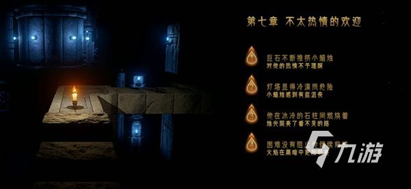 在這款游戲中進行冒險的時候,大家可以發(fā)現(xiàn)周邊的環(huán)境基本上都是非常暗的,只有蠟燭人身上的光芒可以照亮周邊的部分,不過如果蠟燭熄滅那么周邊環(huán)境將會再次陷入黑暗,因此如果蠟燭熄滅的話,那就只能依靠玩家的記憶來移動自己的角色穿過各種復雜的關卡和平臺,最終到達終點即可獲得游戲的勝利。