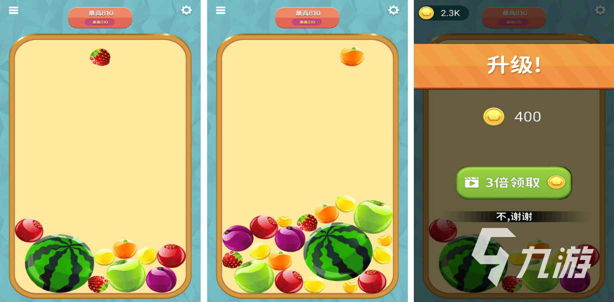 這款游戲也會從屏幕上方掉落一些水果,最小的水果是藍莓,兩個藍莓可以合成一個小草莓,然后再合成橘子、蘋果等水果,如果你成功合成了一個綠色的西瓜,那么恭喜你通過了這個關卡,過關后玩家會得到游戲里的金幣,金幣可以購買水果的外觀哦。