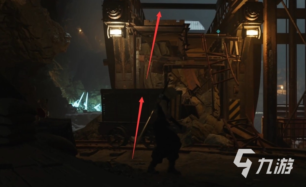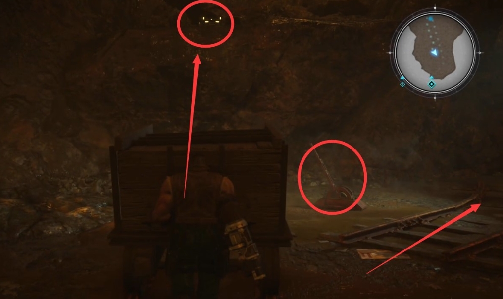 之后繼續(xù)前進(jìn),看到兩個(gè)梯子的時(shí)候把射下來,然后爬上右邊梯子搜刮,就能得到解謎的提示了,再回來爬上左邊梯子,此時(shí)去開門,把礦車給推出去,記得去射碎擋路的石頭。