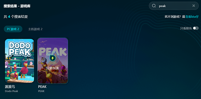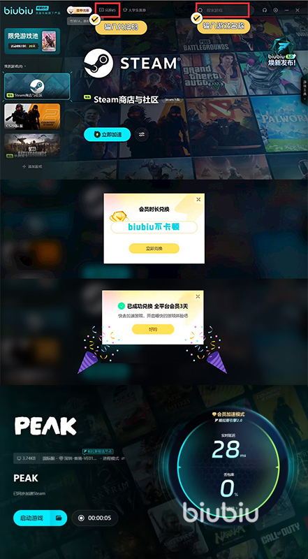 peak游戲?qū)τ诰W(wǎng)速有所要求,在動作競技環(huán)節(jié)中,玩家絲毫不能出錯,才能保證攀登的進度。通過biubiu助力,玩家獲得良好游戲體驗。注冊個人賬號,玩家才能使用自己賬號加速。在軟件首頁中找到peak游戲,開啟加速。玩家一鍵加速之后,能直接查詢當(dāng)前加速狀況,規(guī)避了網(wǎng)速波動風(fēng)險,保證當(dāng)前網(wǎng)絡(luò)傳輸結(jié)果。