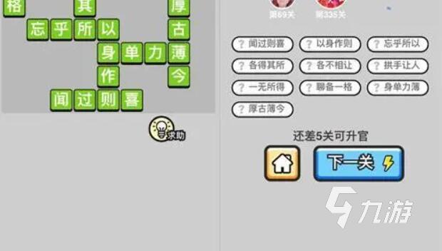 這是一款很經(jīng)典的猜字類(lèi)游戲,畫(huà)面十分簡(jiǎn)潔美觀(guān),操作也相當(dāng)簡(jiǎn)單,玩家在游戲中根據(jù)部分提示把完整的詞語(yǔ)拼出來(lái)即可過(guò)關(guān)。該游戲涵蓋了古今各種成語(yǔ),文化底蘊(yùn)相當(dāng)深厚,對(duì)于玩家的成語(yǔ)基礎(chǔ)是很大的考驗(yàn)。而且游戲中還有趣味的官階系統(tǒng),玩家通過(guò)闖關(guān)可以逐漸的提升官階,成長(zhǎng)的過(guò)程也很有意思。